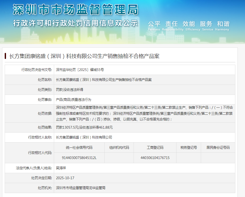 齐鲁晚报·齐鲁壹点记者于深圳市市场监督管理局信用双公示栏获悉,10月17日,ST长方(300301.SZ)旗下的长方集团康铭盛(深圳)科技有限公司(下称“长方康铭盛”)收罚单,处罚事由为产品(商品)质量违法行为,处罚决定书文号:深市监华处罚〔2025〕福城55号。
