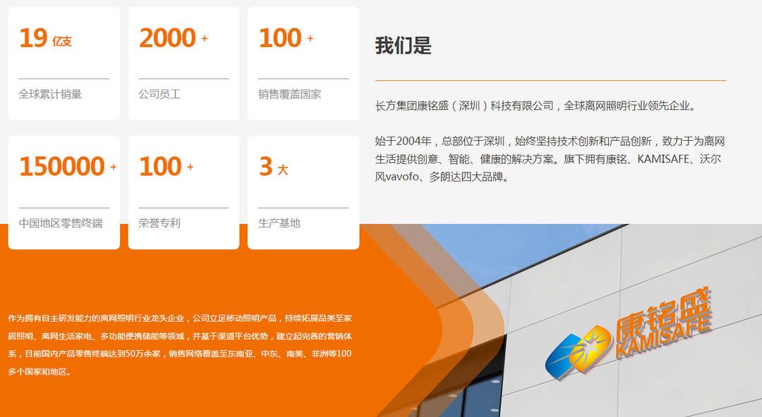 据长方康铭盛官网介绍,作为拥有自主研发能力的离网照明行业龙头企业,公司立足移动照明产品,持续拓展品类至家居照明、离网生活家电、多功能便携储能等领域,旗下拥有康铭、KAMISAFE、沃尔风vavofo、多朗达四大品牌。目前,其国内产品零售终端达到50万余家,销售网络覆盖至东南亚、中东、南美、非洲等100多个国家和地区。