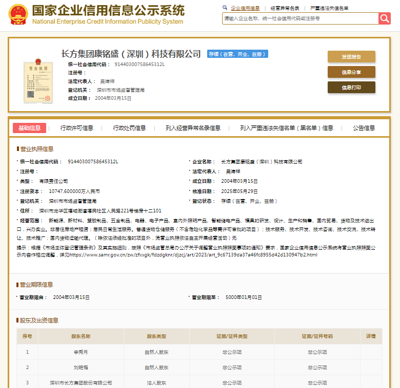 国家企业信用信息公示系统显示,长方集团康铭盛(深圳)科技有限公司成立于2004年,注册资本10747.6万元人民币,法定代表人为吴涛祥,大股东为ST长方(300301.SZ),持股比例99.8660%。